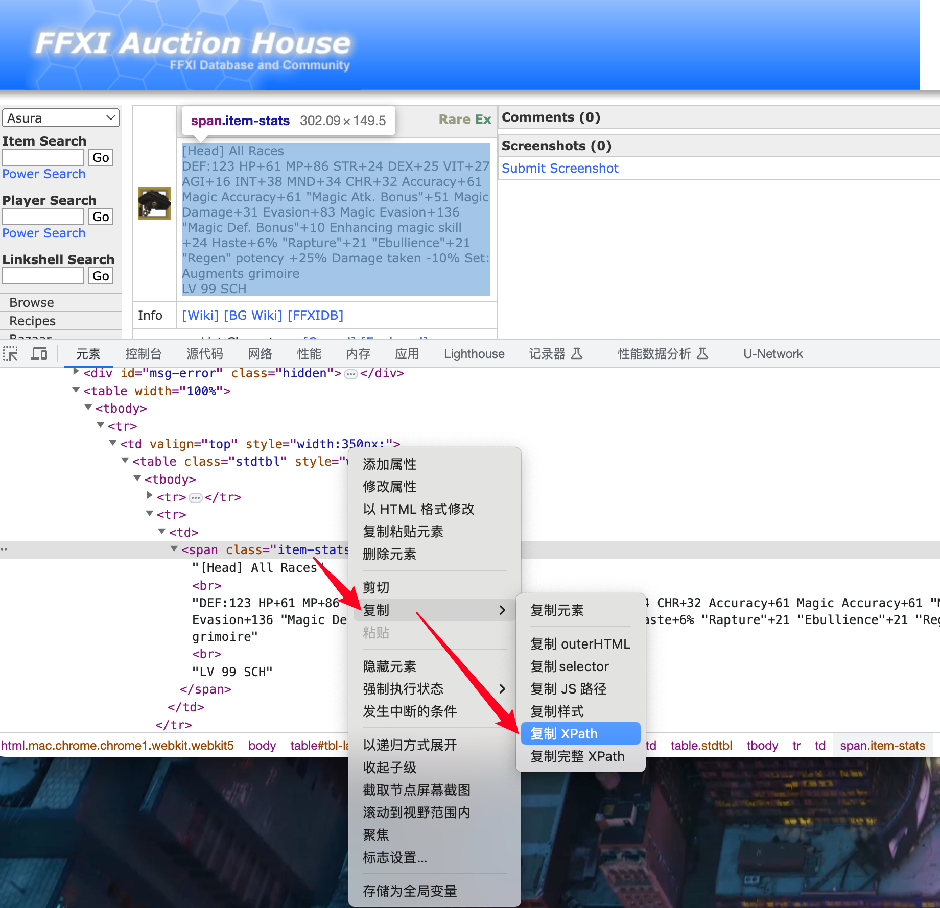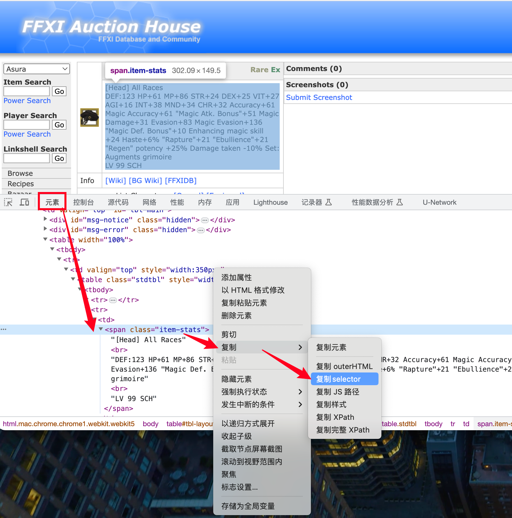 通过复制浏览器Selector获取的路径得到;<span class="item-stats">[Head] All Races<br>DEF:123 HP+61 MP+86 STR+24 DEX+25 VIT+27 AGI+16 INT+38 MND+34 CHR+32 Accuracy+61 Magic Accuracy+61 "Magic Atk. Bonus"+51 Magic Damage+31 Evasion+83 Magic Evasion+136 "Magic Def. Bonus"+10 Enhancing magic skill +24 Haste+6% "Rapture"+21 "Ebullience"+21 "Regen" potency +25% Damage taken -10% Set: Augments grimoire<br>LV 99 SCH</span>