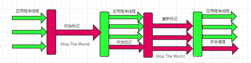 从GC Roots的直接引用对象开始依次扫描(对上面的黑色箭头的链路做扫描),这个过程需要比较多的时间,用户线程和GC线程同时执行,不会产生STW,因为在扫描的过程中用户线程还在不断的执行所以可能会出现标记过的对象又变成了垃圾。