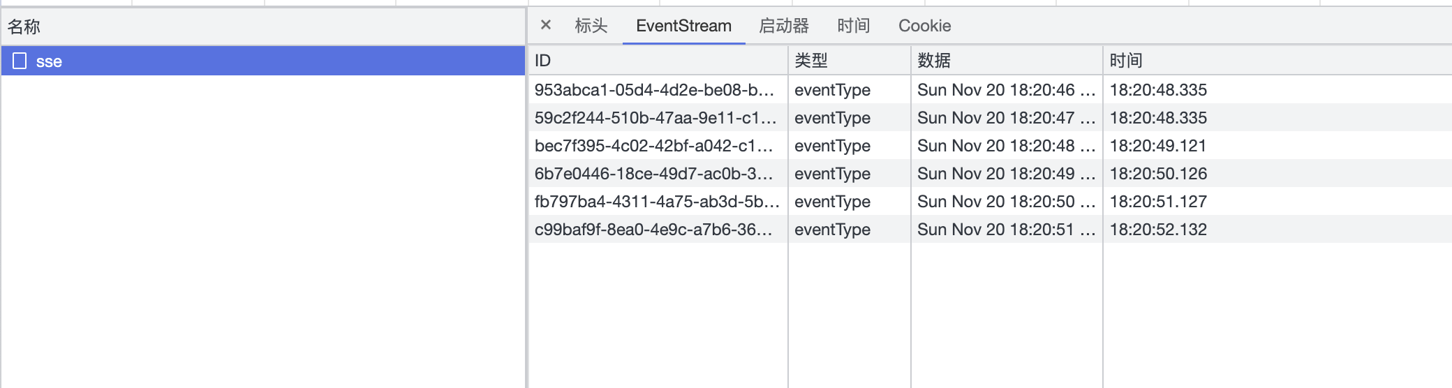 注意一点:sse的消息实际上只会有一个网络请求。消息藏在EventStream中。每条消息会在此EventStream中是一个记录。下文是客户端接受到服务端多条消息推送的示例。