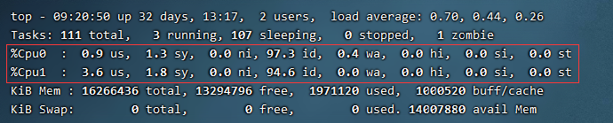 数字“1” 可以查看/切换所有CPU单核情况 (不按1的话,显示的是所有cpu的使用率)