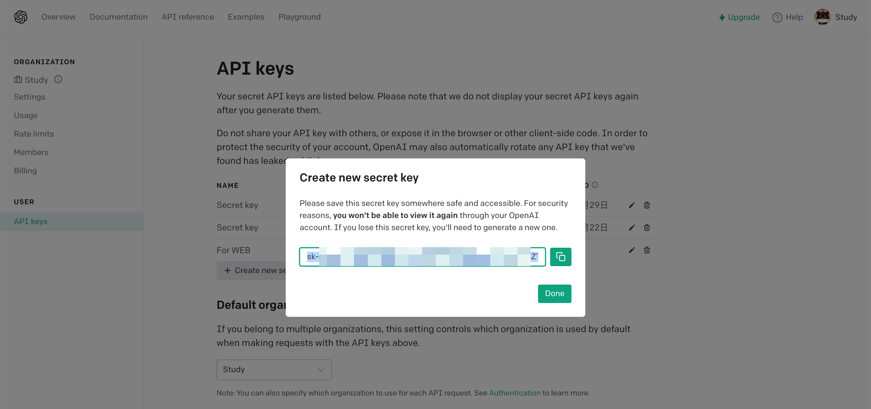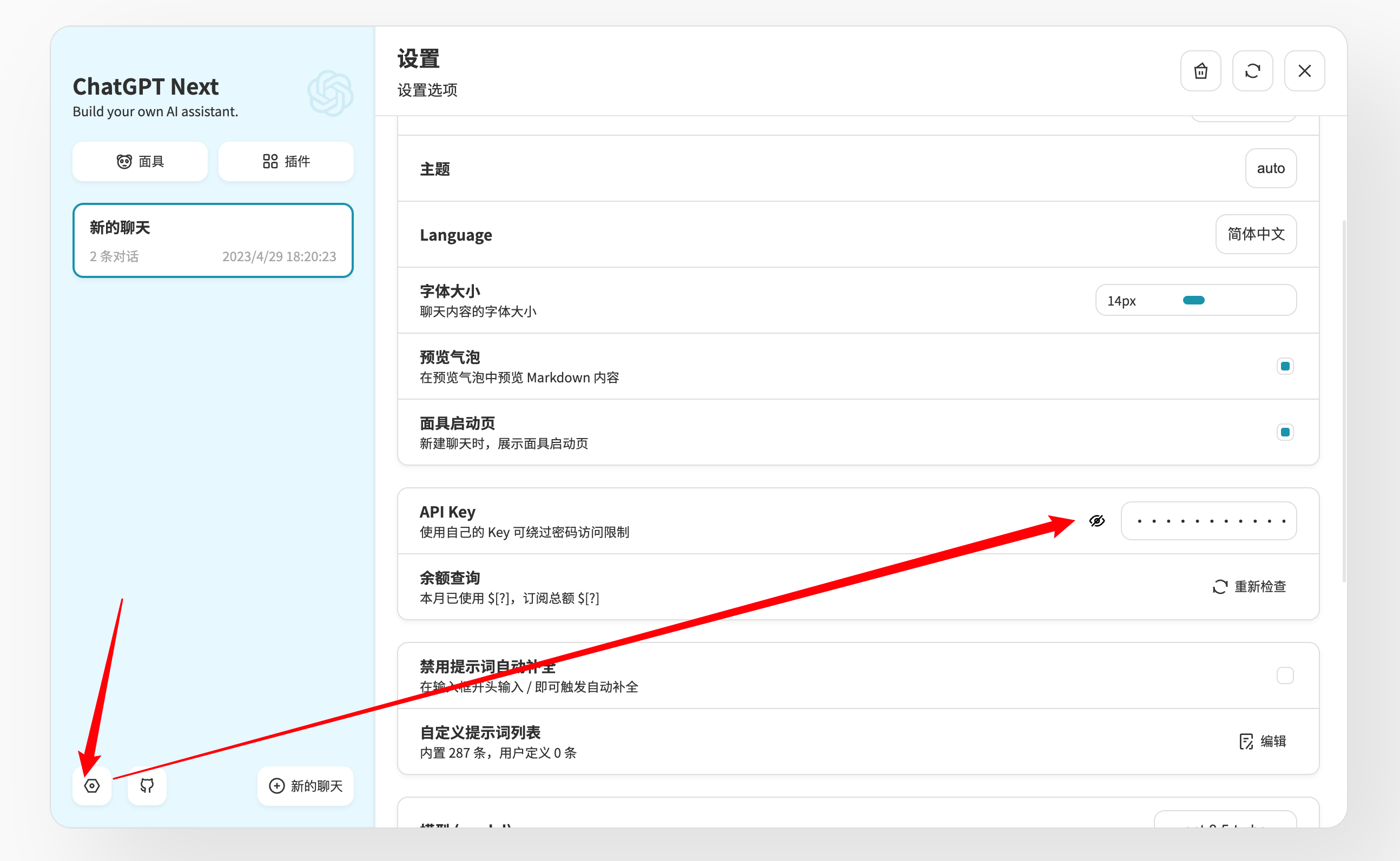 左下角有个设置,点击去OpenAI官网弄个API KEY 输入进去: