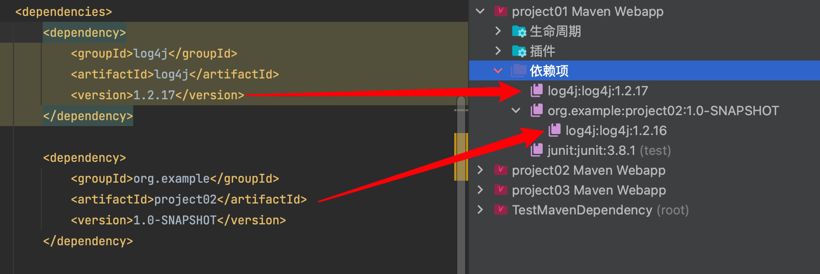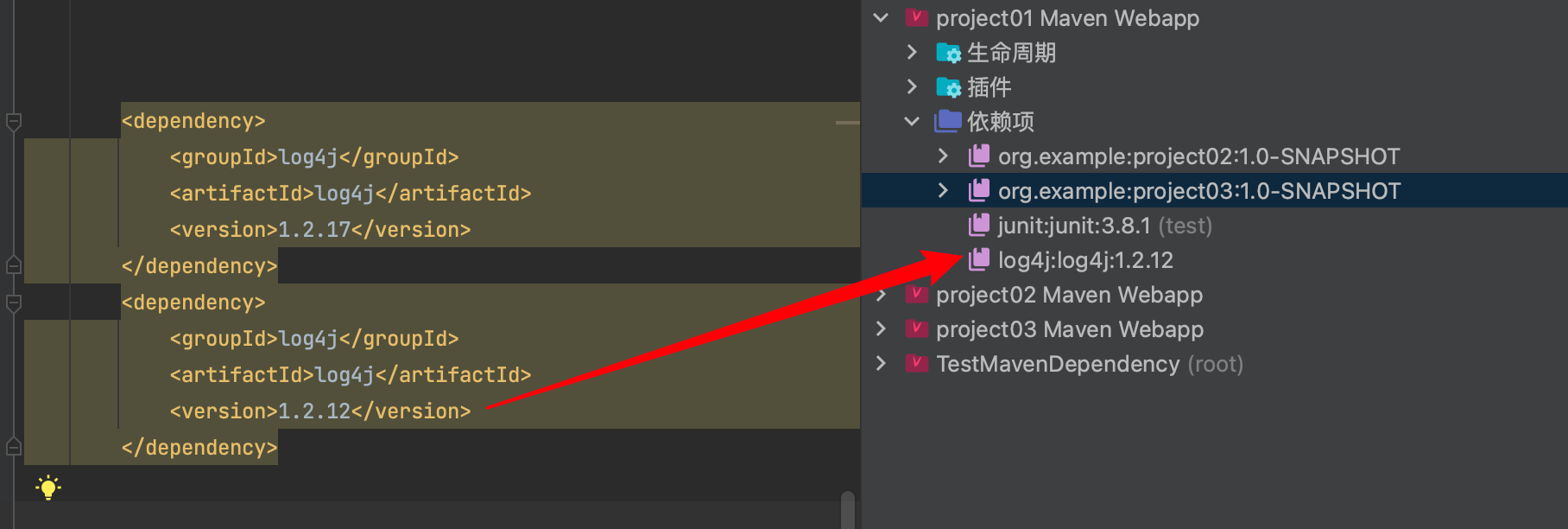 【示例】项目A引入log4j:1.2.17、log4j:1.2.12(直接引入了2个)。如果log4j:1.2.17写在log4j:1.2.12的上面,则后面版本覆盖前版本。project01 使用log4j:1.2.12。