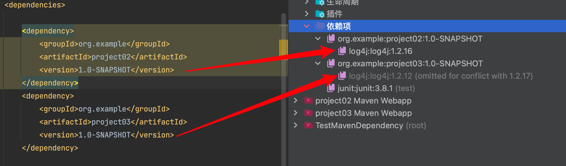 【示例】project01 引入project02、project03。project02是log4j:1.2.16 、project03是log4j:1.2.12。Maven坐标在引入project02、03的时候,project02坐标写在project03坐标上面,则project02覆盖03的logback。project01使用logback:1.2.16