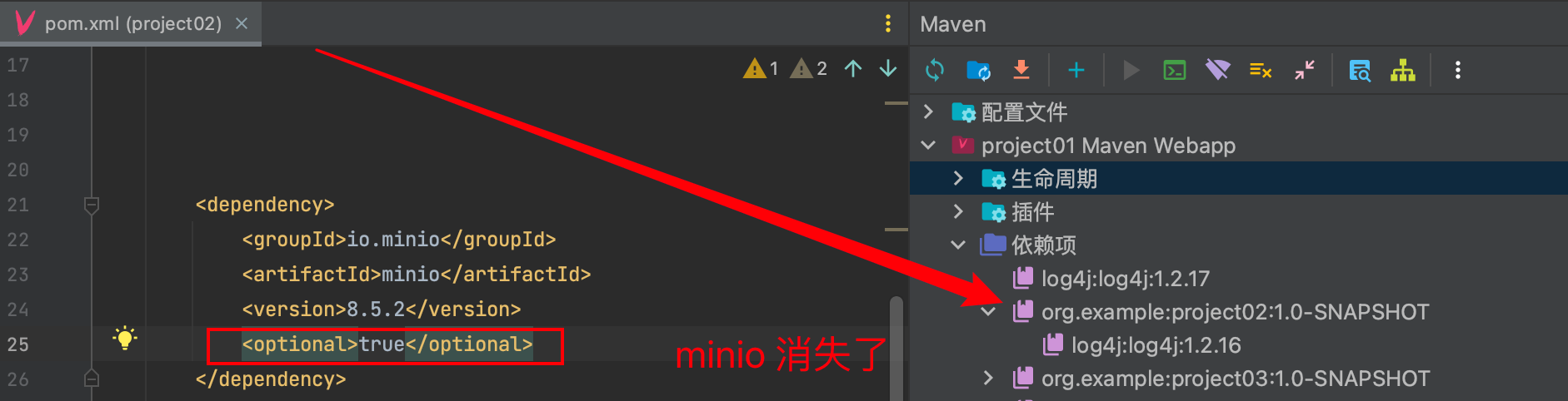 比如项目A依赖了项目B,如果项目B使用了minio,同时标注了optional = true。则项目A看不到项目B引用的内容了。