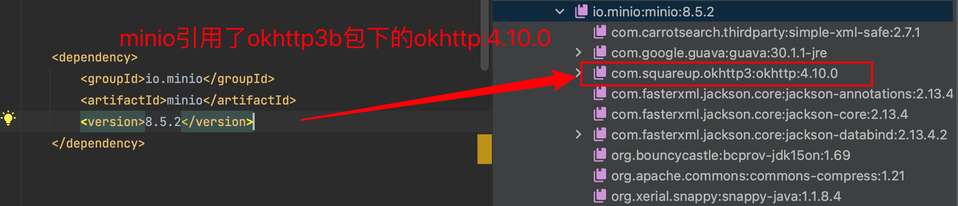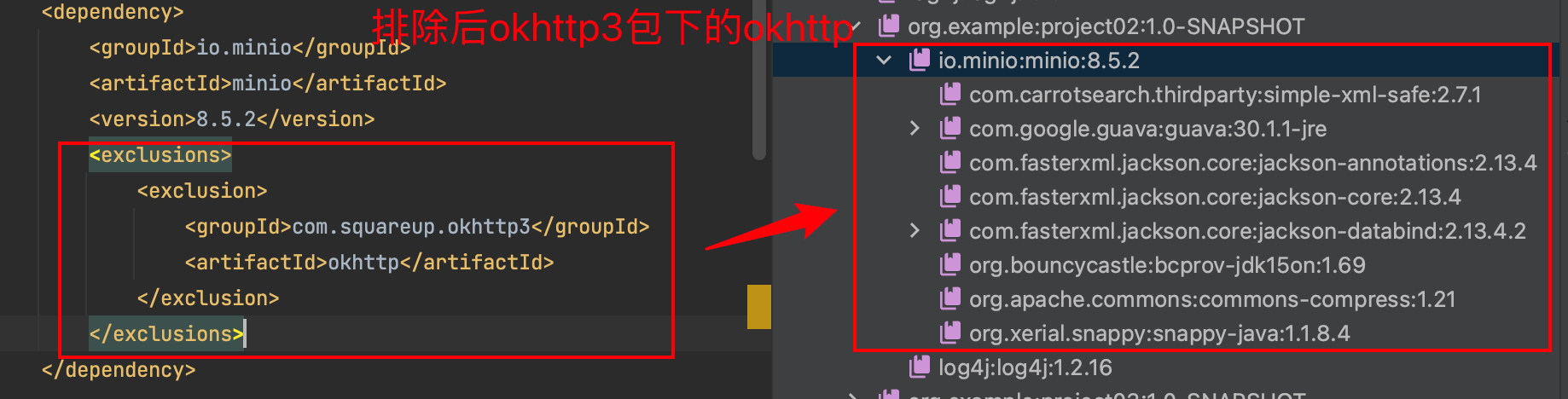 排除依赖:比如一个项目中有1个okhttp的依赖,引入一个minio,但是minio自己本身引入一个okhttp的依赖。如果我们不想让minio使用自己的okhttp,我们就可以使用exclusions 来排除minio自己的okhttp。