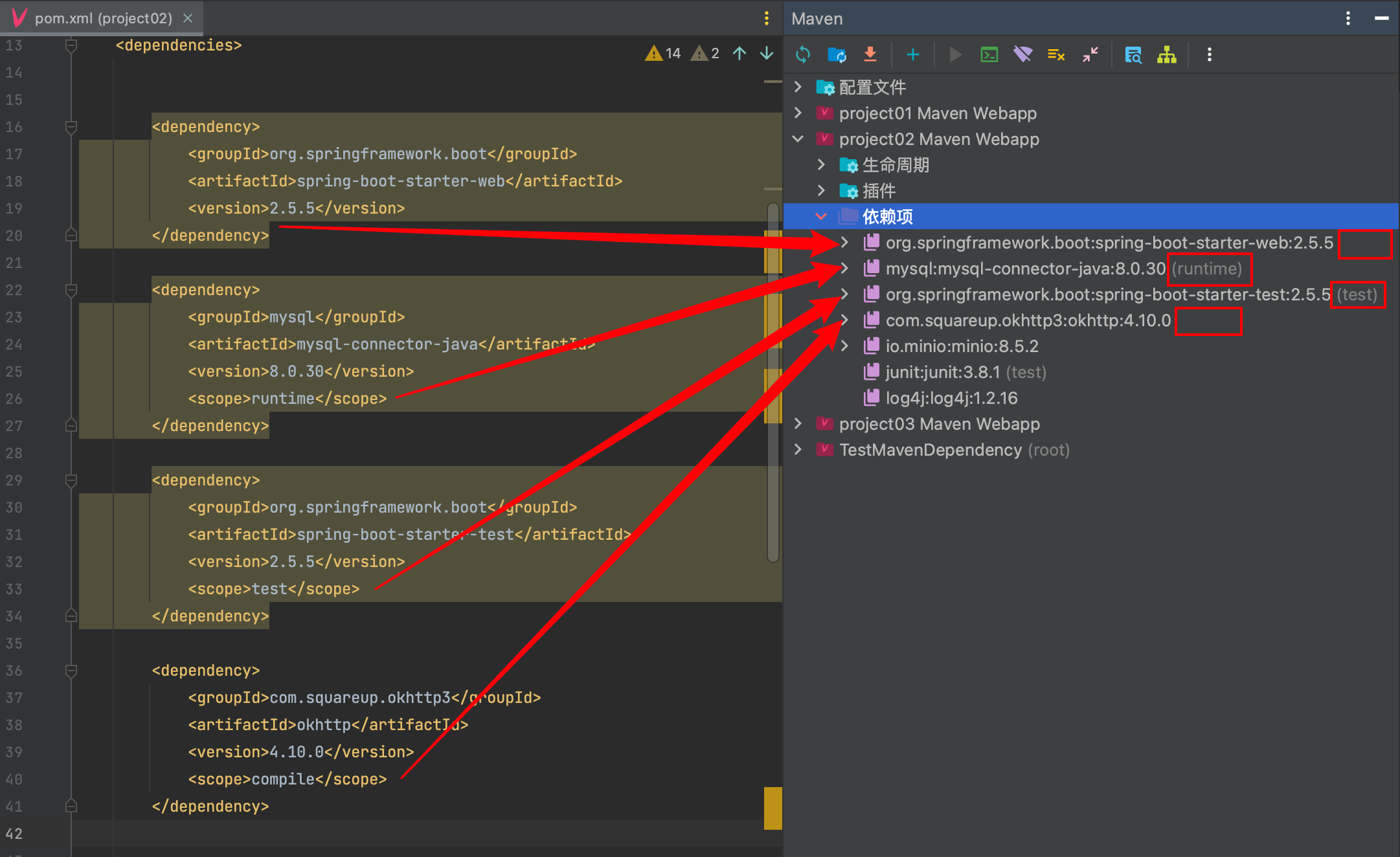 有的scope是runtime、test、compile,有的没写scope标签