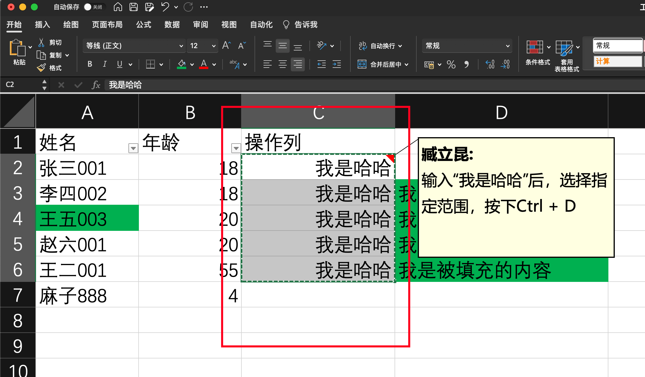 选中一片区域,将下文全部应用为第一行单元格的值。