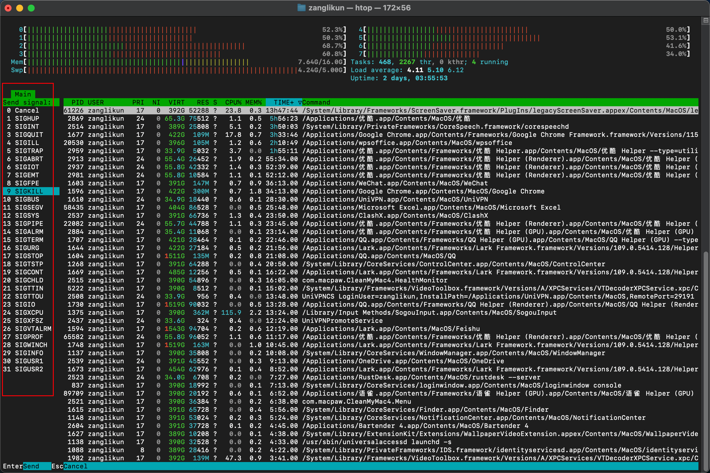 htop可视化交互操作:杀死进程