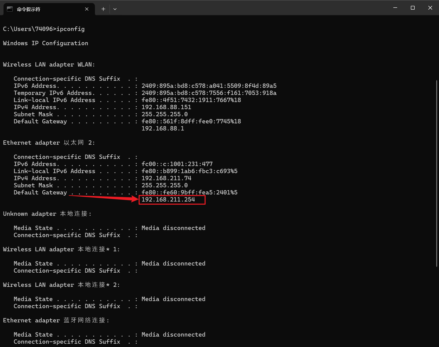 多网卡之间的使用的路由器是不一样的。我们需要选择内网的一个网卡的路由器地址。