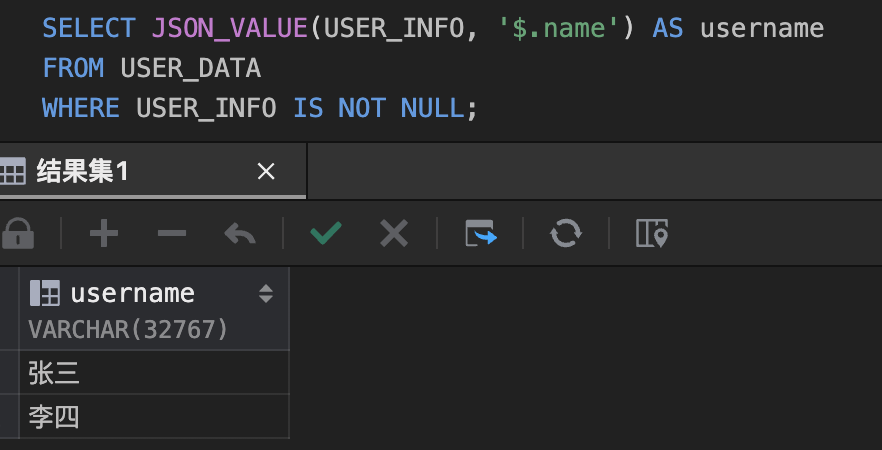 SELECT JSON_VALUE(USER_INFO, '$.name') AS username