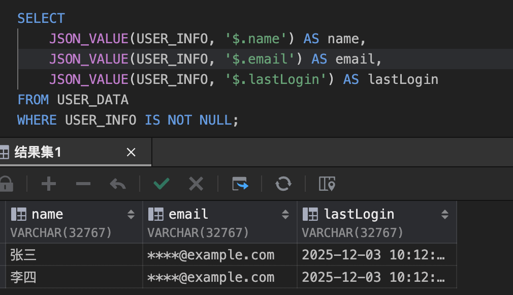 JSON_VALUE(USER_INFO, '$.email') AS email, -- 这里的 email 已经脱敏