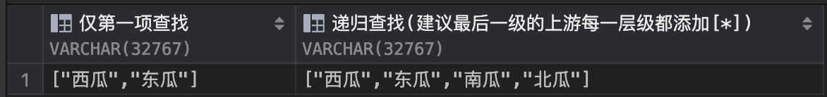 JSON_QUERY('[{"food":[{"name":"西瓜"},{"name":"东瓜"}]},{"food":[{"name":"南瓜"},{"name":"北瓜"}]}]', '$.food[*].name' WITH WRAPPER) AS "递归查找(建议最后一级的上游每一层级都添加[*])"