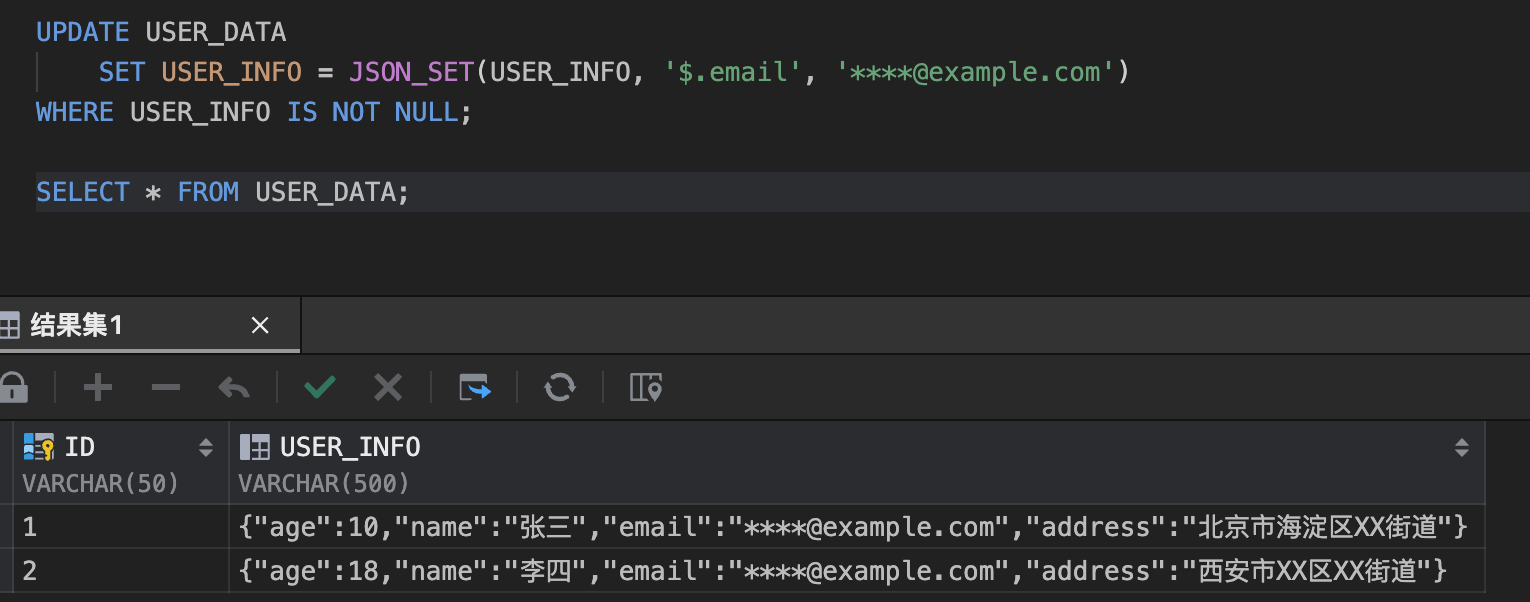 SET USER_INFO = JSON_SET(USER_INFO, '$.email', '****@example.com')