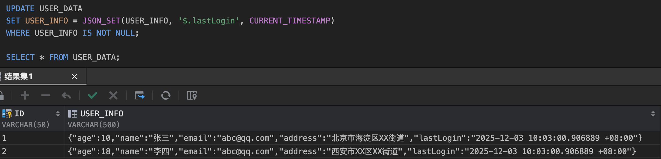 假设你想在 JSON 字段 USER_INFO 中添加一个新的键 lastLogin,并设置其值为当前时间。