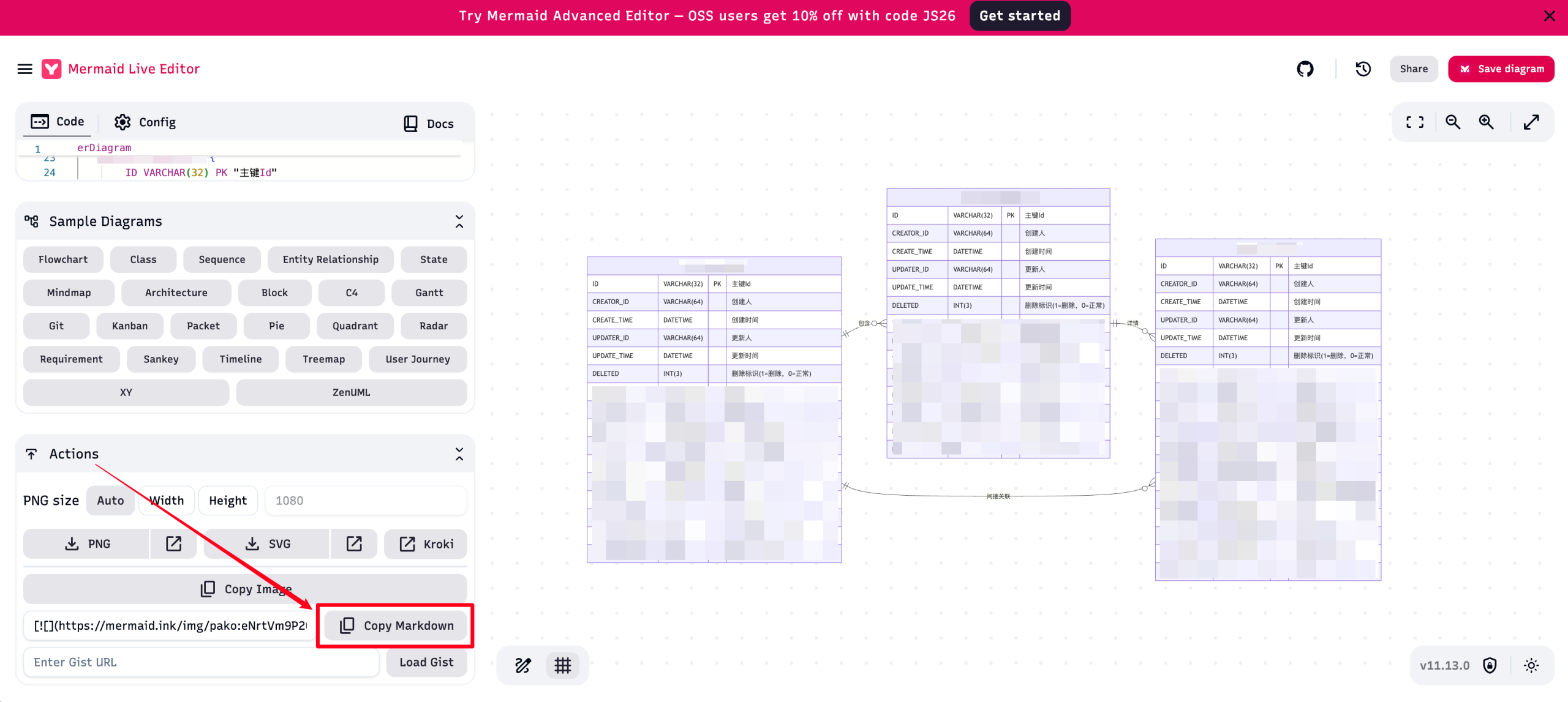 官网:https://mermaid.live 输入你的代码,找到Actions - Copy Markdown - 直接粘贴到Markdown里面即可。
