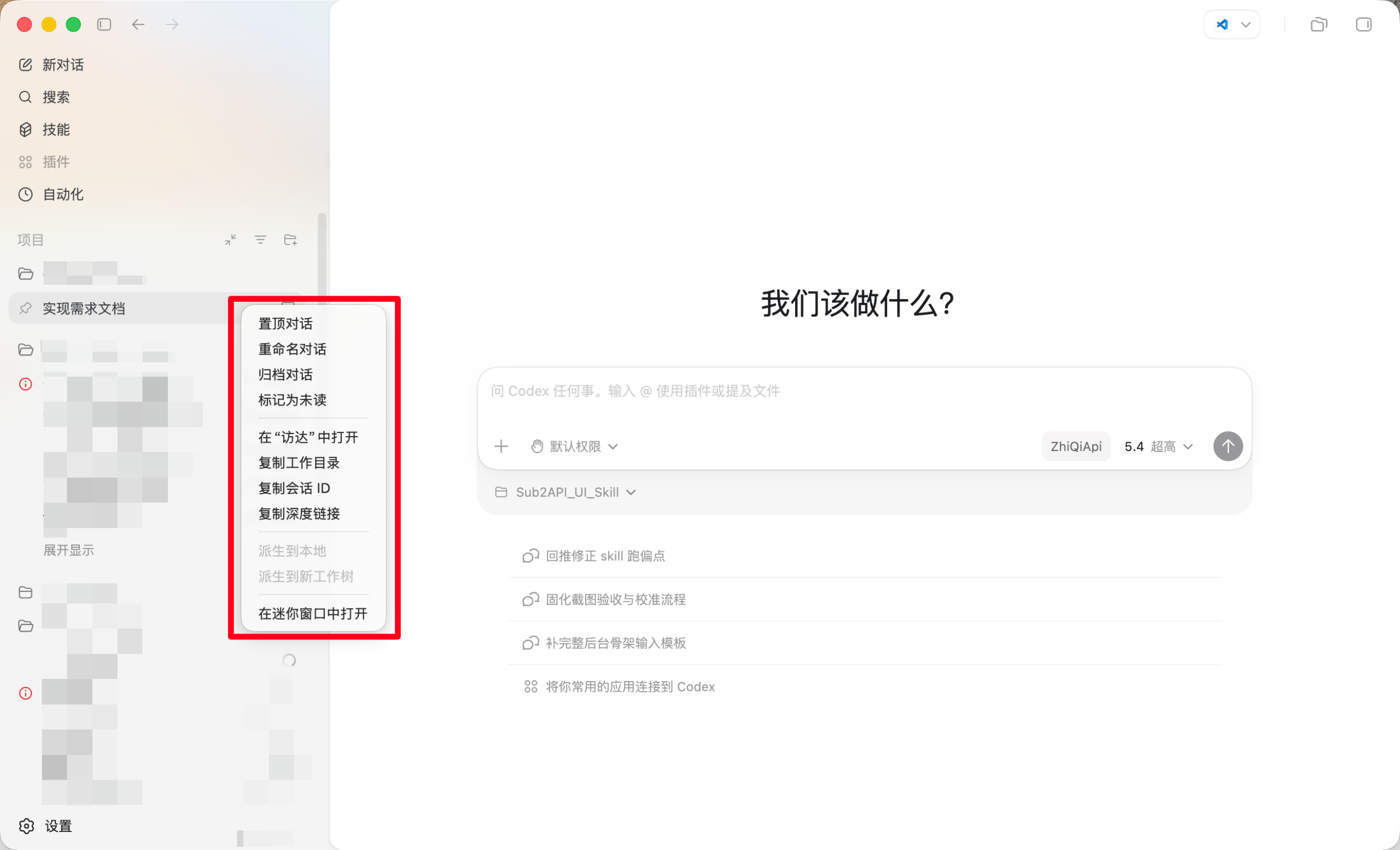派生到本地:基于当前会话“另开一个本地分支会话”继续做,原会话保留,新会话单独发展。派生到新工作树:基于当前会话新建一个 Git worktree 来继续,适合并行开发、试不同方案、避免互相污染。- 在迷你窗口中打开:把这个会话放到更小的独立窗口里,适合边写代码边看对话。