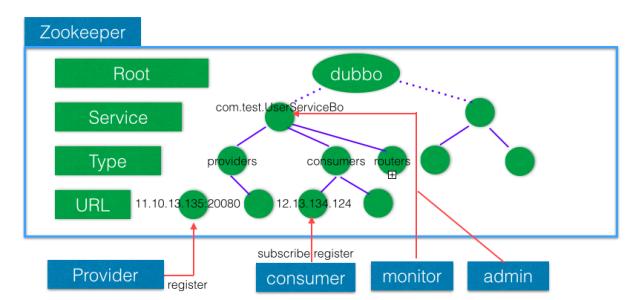 首先 根节点存储的是Dubbo,然后下面存储服务,每个服务下面有它的类型,每个类型下面都记录这进程的地址。