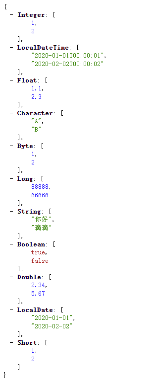 请求:http://localhost:8080/news/post?string=你好&bo=true&s=1&by=1&l=88888&f=1.1&d=2.34&c=A&i=1&localDate=2020-01-01&localDateTime=2020-01-01 00:00:01&string=滴滴&bo=false&s=2&by=2&l=66666&f=2.3&d=5.67&c=B&i=2&localDate=2020-02-02&localDateTime=2020-02-02 00:00:02