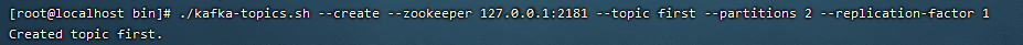./kafka-topics.sh --create --zookeeper 127.0.0.1:2181 --topic first --partitions 2 --replication-factor 1