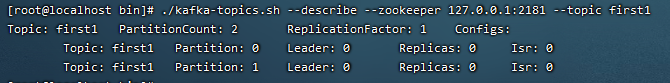 ./kafka-topics.sh --describe --zookeeper 127.0.0.1:2181 --topic first1