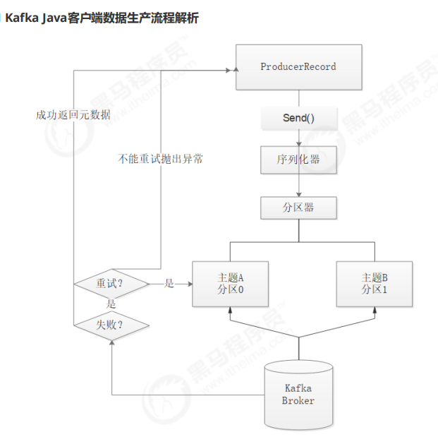 ⑥、Broker成功接收到消息,表示发送成功,返回消息的元数据(包括主题和分区信息以及记录在 分区里的偏移量)。发送失败,可以选择重试或者直接抛出异常。