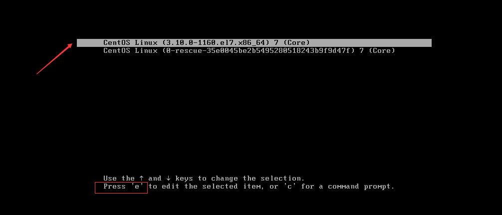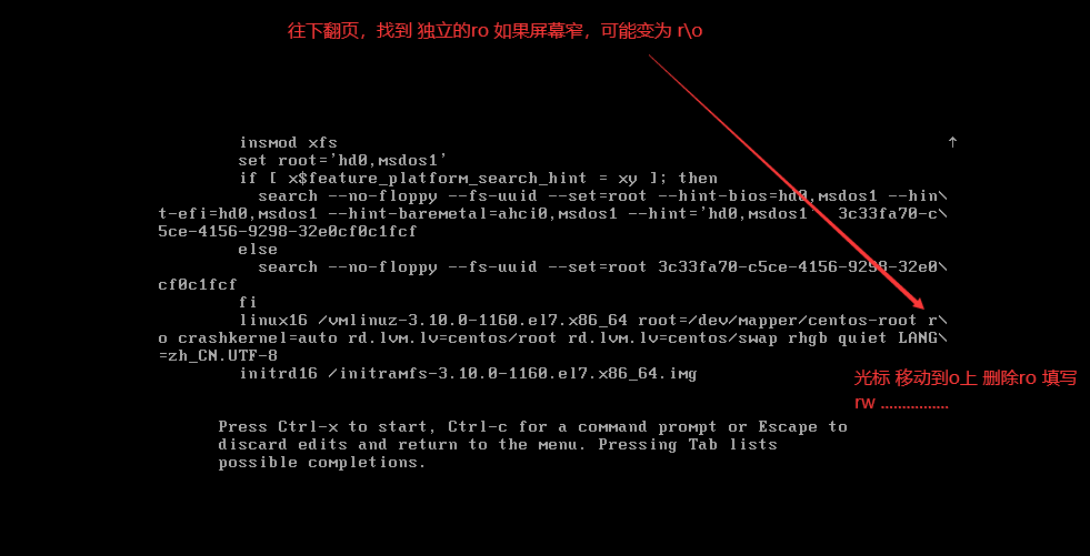 进入后 往下翻页 定位到linux16开头 将ro 修改为 rw init=/sysroot/bin/bash