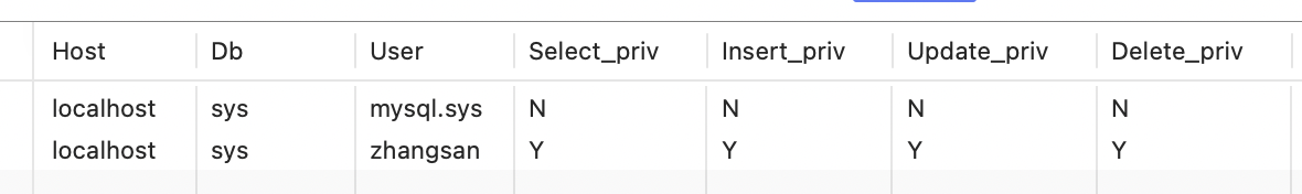 这个输出的意思是:zhangsan@localhost拥有sys表的查询、插入、更新、删除等权限。