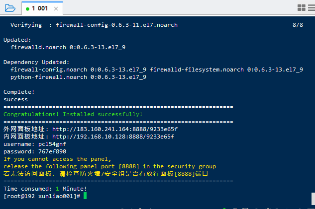 安装完成即可。如果需要root密码或者修改root密码,自行前去修改即可!
