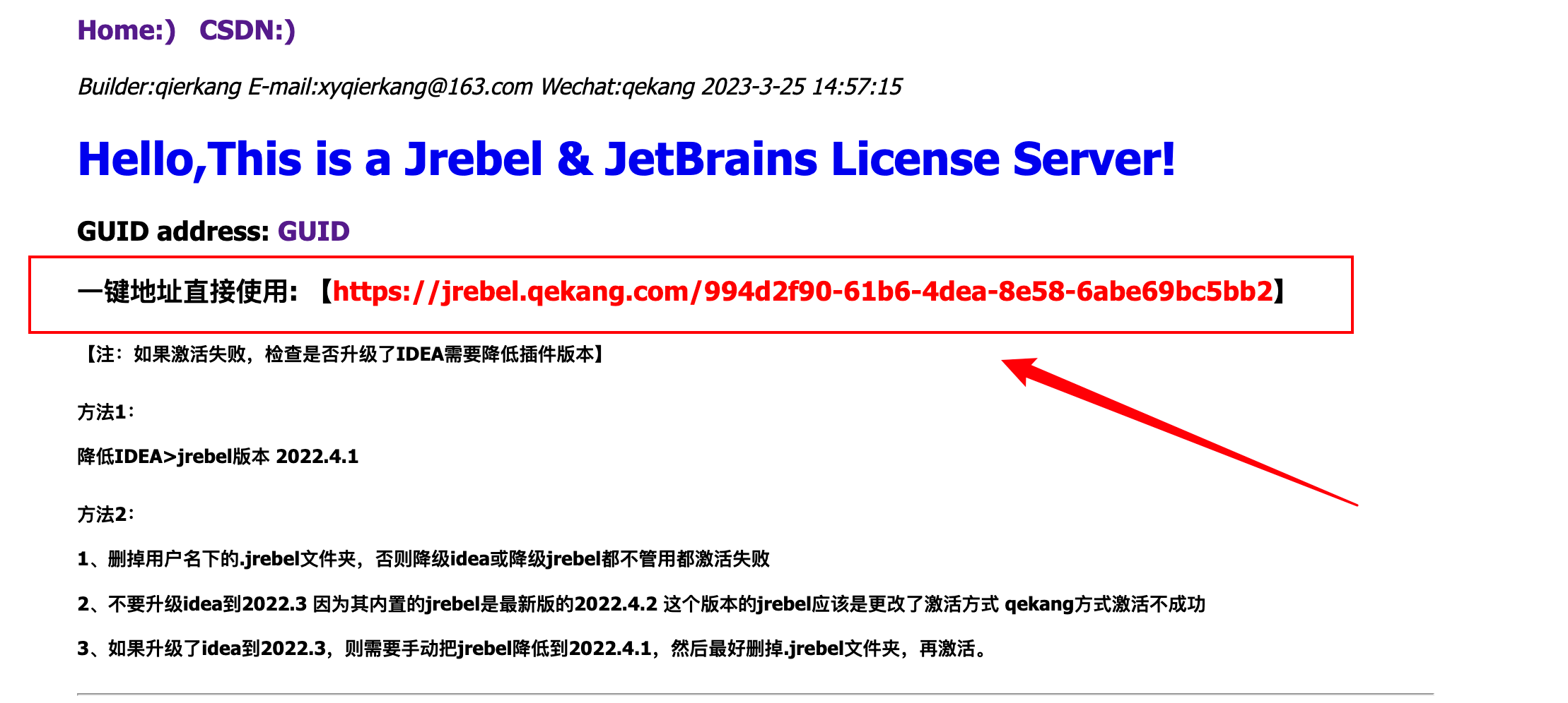 请参考:https://jrebel.qekang.com/ ,访问如下:(别人搭建的不支持最新版本IDEA,我自建服务器支持最新的哦)