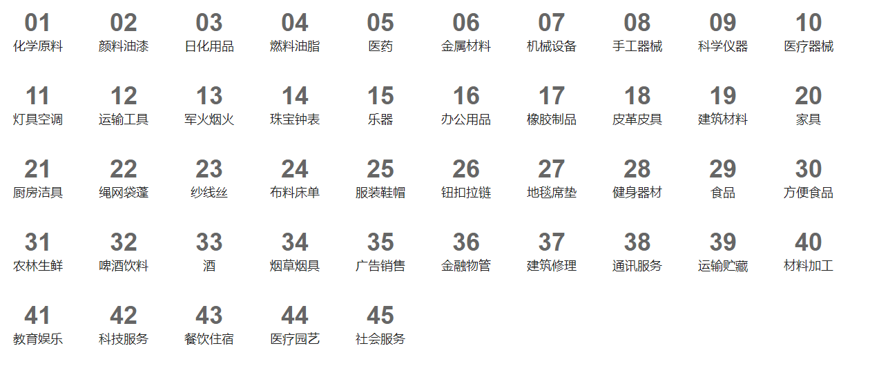 中国商标共计45大类,其中第1-34大类为商品商标,第35-45大类为服务商标