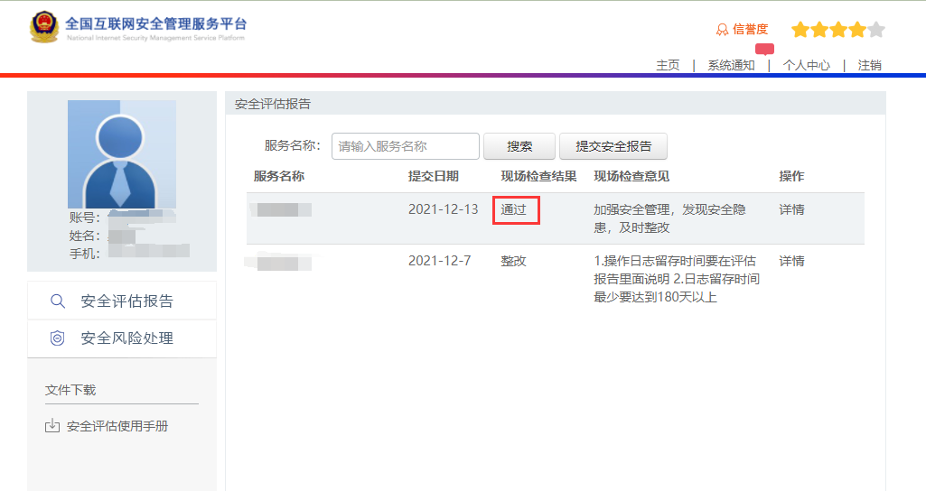 (3)《安全评估报告》在全国互联网安全服务管理平台的提交结果截图,展示已通过即可。