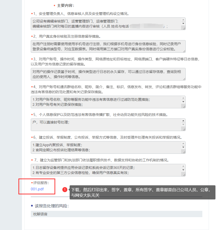 (2)《安全评估报告》加盖公章 特别说明:一定要签字盖章,这个需要找到点击下面第三项 通过的详情,找到最下面,点击下载即可。然后处理完后,PS处理合并成一张图片,再去提交。