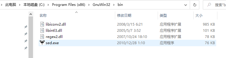 安装的程序时GnuWin 我感觉 功能很强大!从里面的bin文件提取相关sed.exe 为了防止目前系统没有相关运行库,我们还是需要复制相关的库走!