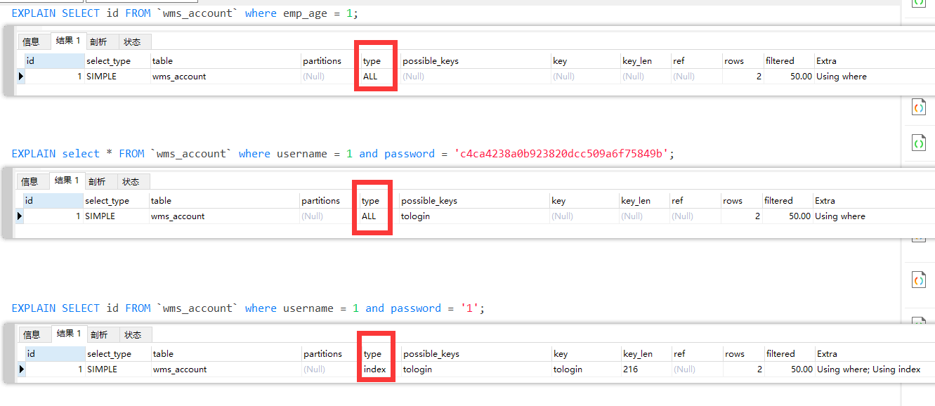 第一次查询的emp_age 是没有索引的,所以type是全表扫描