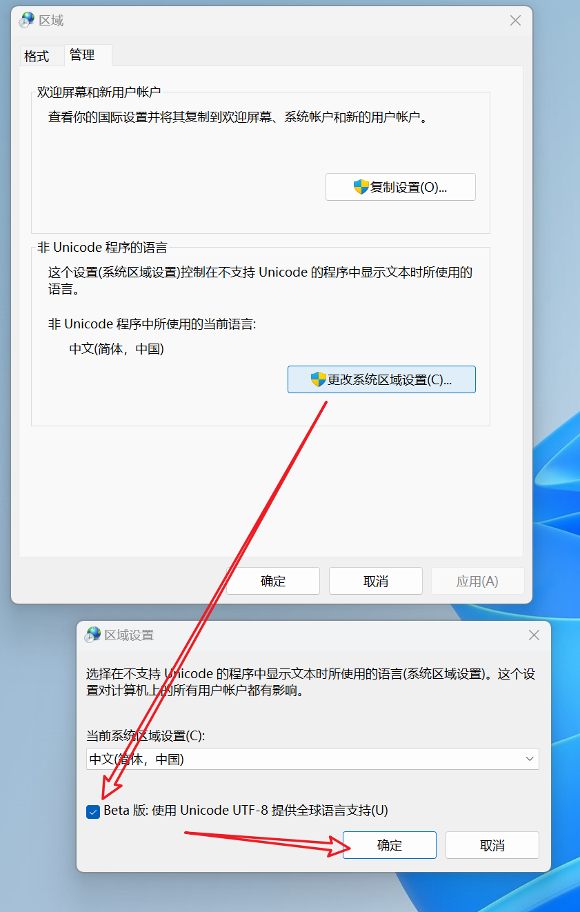 设置Windows区域开启"非Unicode程序的语言",选择"Beta版本,使用UnicodeUTF-8提供全球语言支持"!