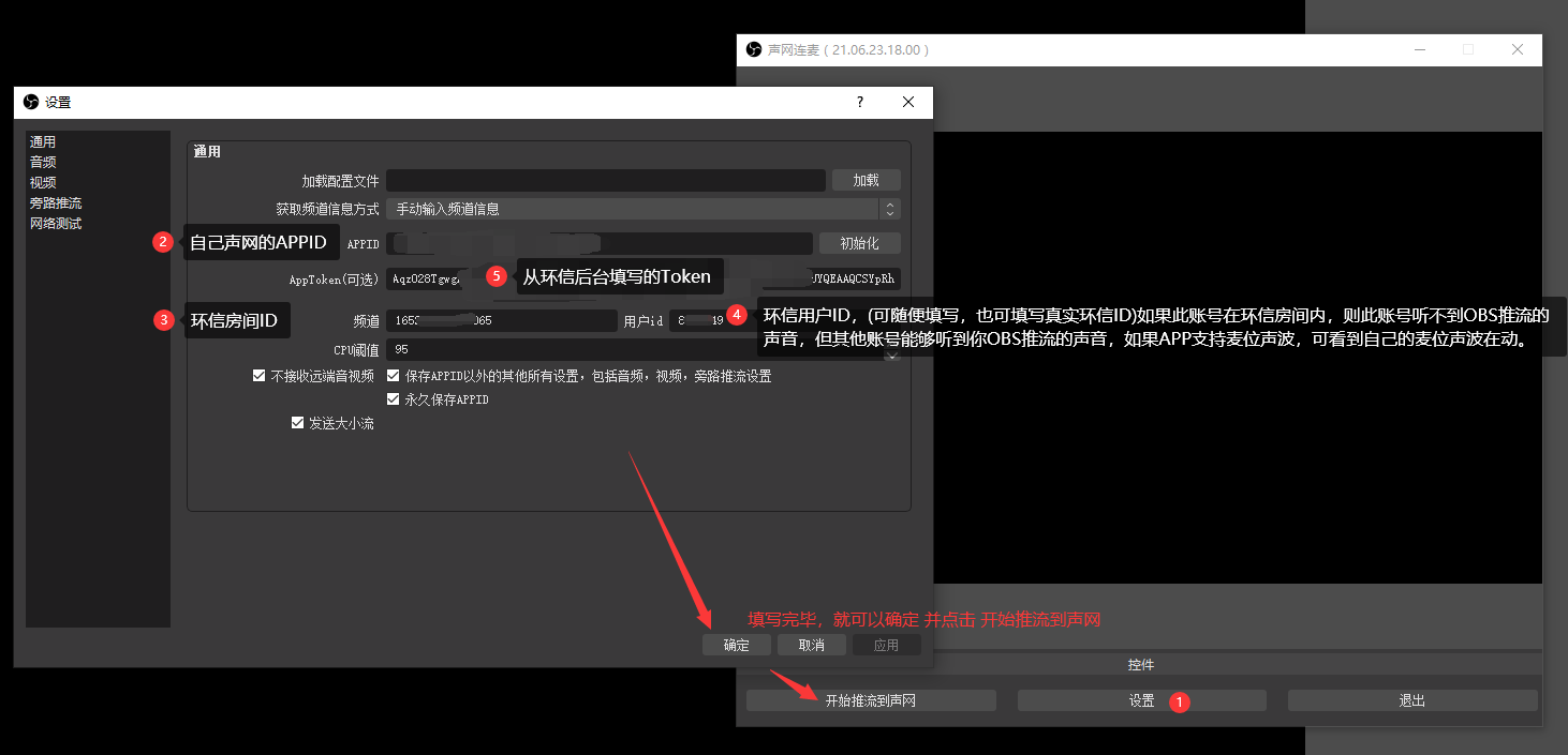 信息在OBS的声网插件填充完成,确保信息准确,即可开始推流。