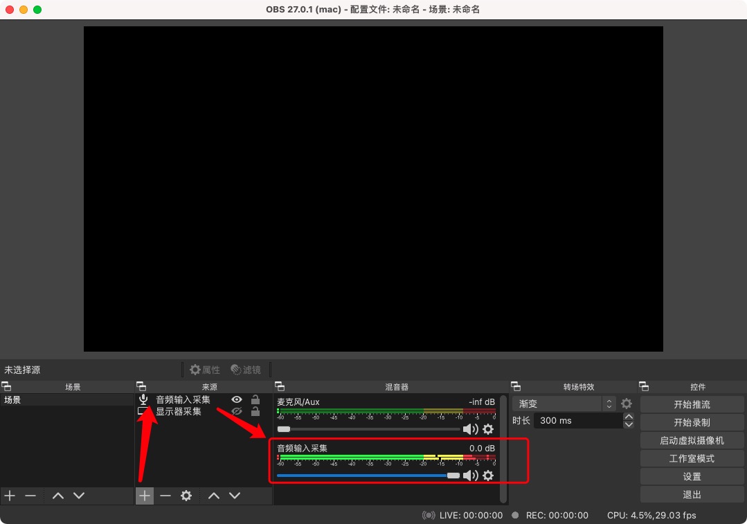 额外备注 :Mac系统安装OBS 是无法开启桌面音频的,如果遇到此情况,请安装 Background Music 地址是:https://github.com/kyleneideck/BackgroundMusic/releases 自行下载安装完成,在OBS(不是声网插件) 添加"音频输入采集" 然后系统内播放歌曲,就会发现自己刚加入的音频输入音频新号变动,就可以推送本地系统的音频了!