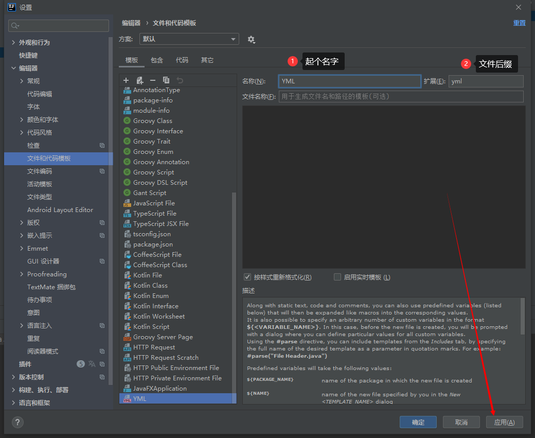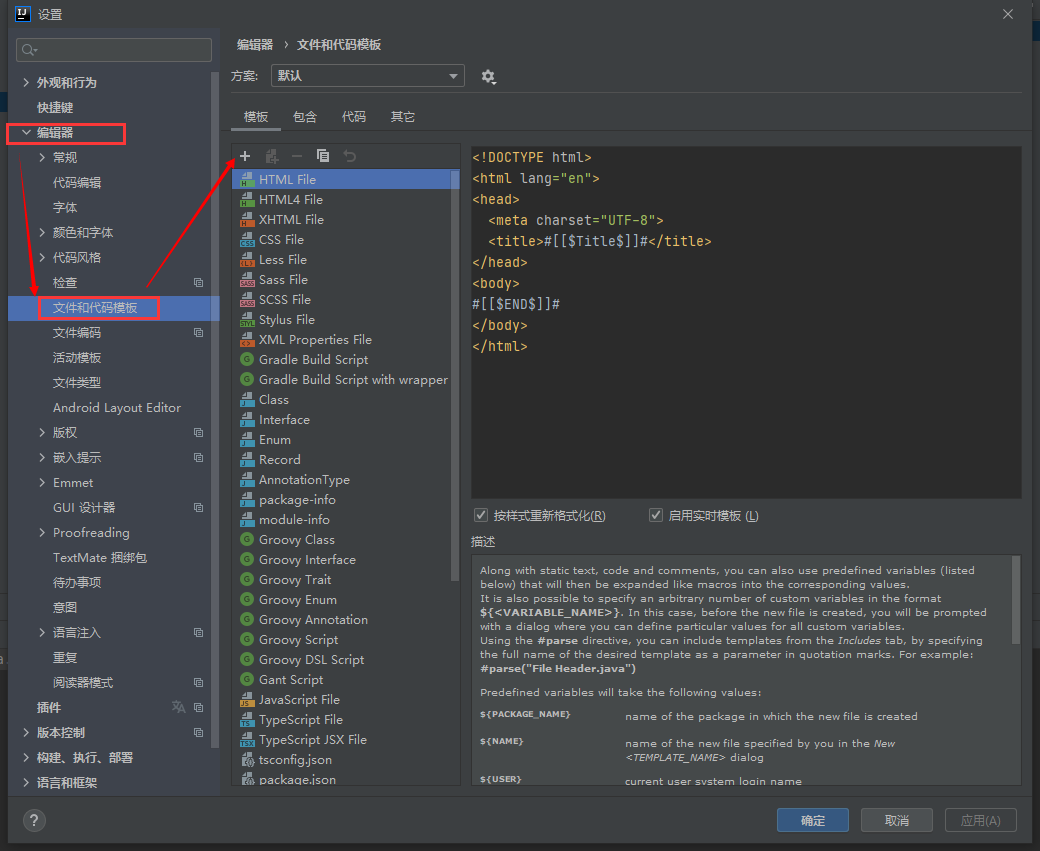 找到 编辑器 文件和代码模板 点一下 + 按钮
